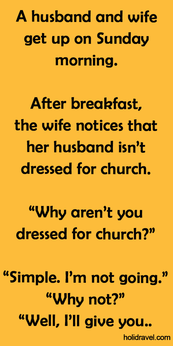 A husband and wife get up on Sunday morning. After breakfast, the wife notices that her husband isn’t dressed for …