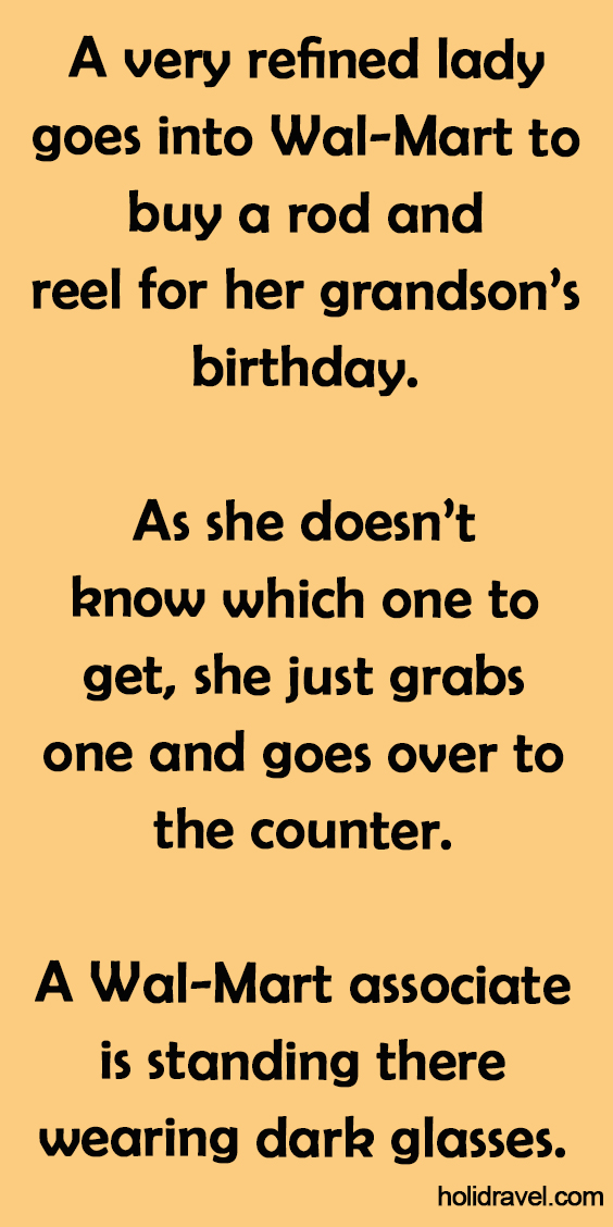 A very refined lady goes into Wal-Mart to buy a rod and reel for her grandson’s birthday. As she doesn’t …