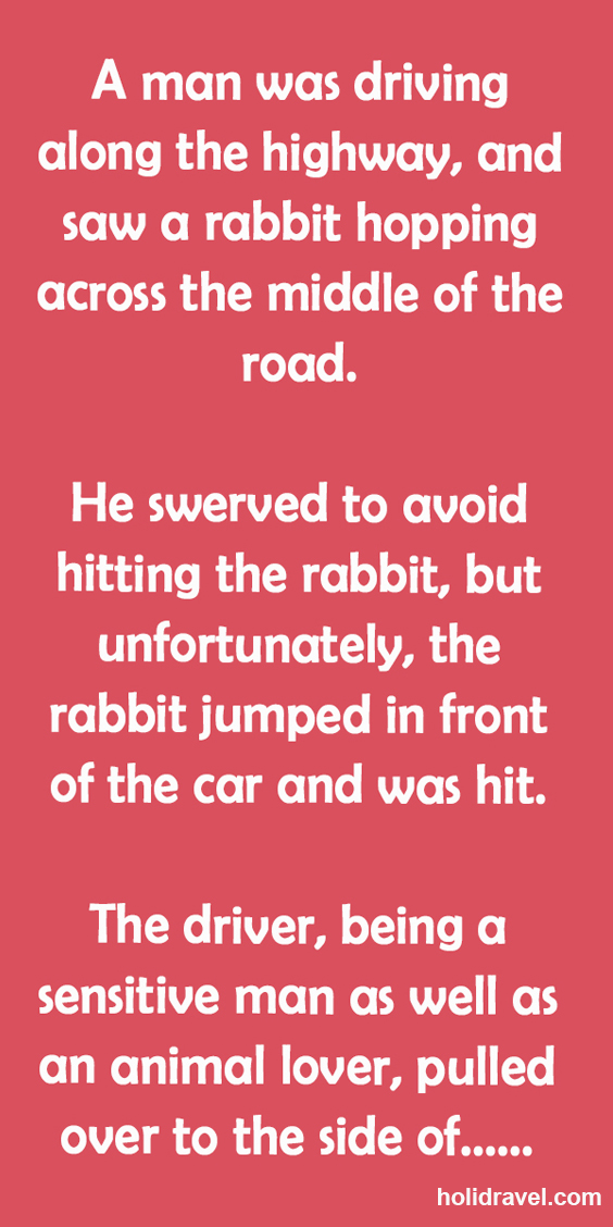 A man was driving along the highway, and saw a rabbit hopping across the middle of the road. He swerved …