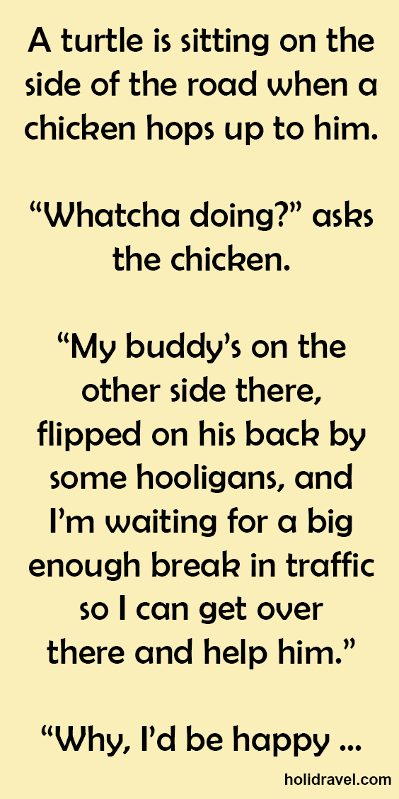 A turtle is sitting on the side of the road when a chicken hops up to him. “Whatcha doing?” …
