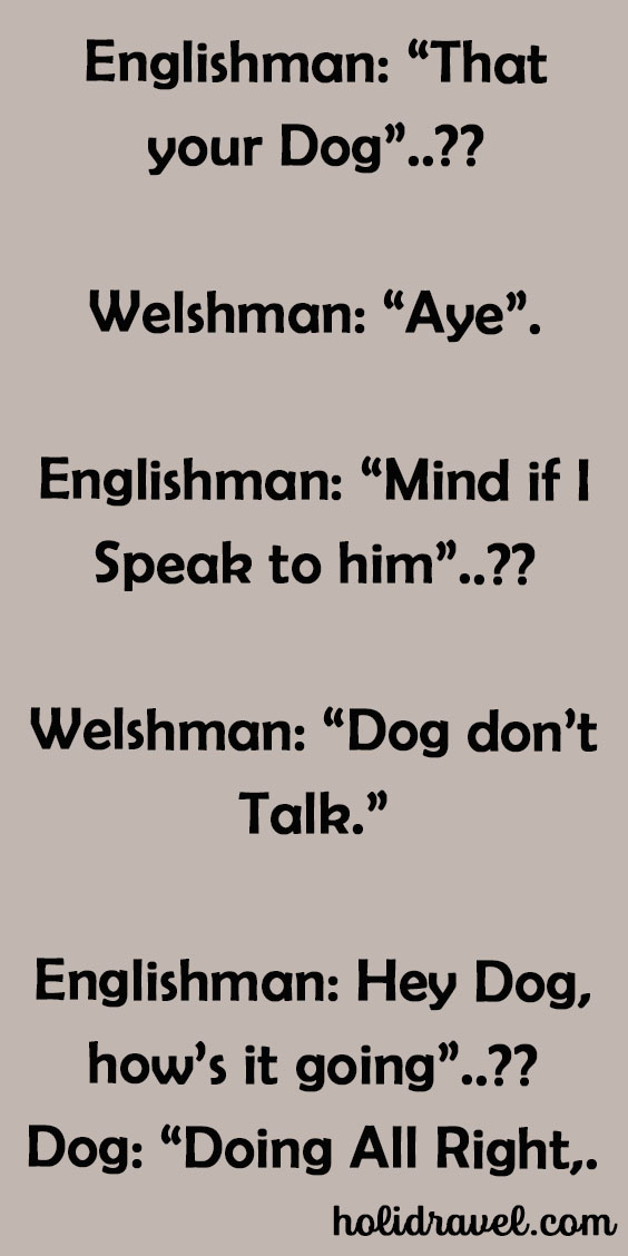 Englishman: “That your Dog”..?? Welshman: “Aye”. Englishman: “Mind if I Speak to him”..?? Welshman: “Dog don’t Talk.” Englishman: Hey Dog, …