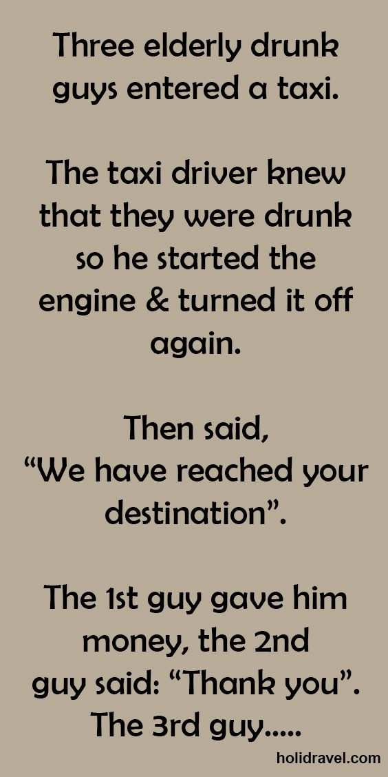 Three elderly drunk guys entered a taxi. The taxi driver knew that they were drunk so he started the …