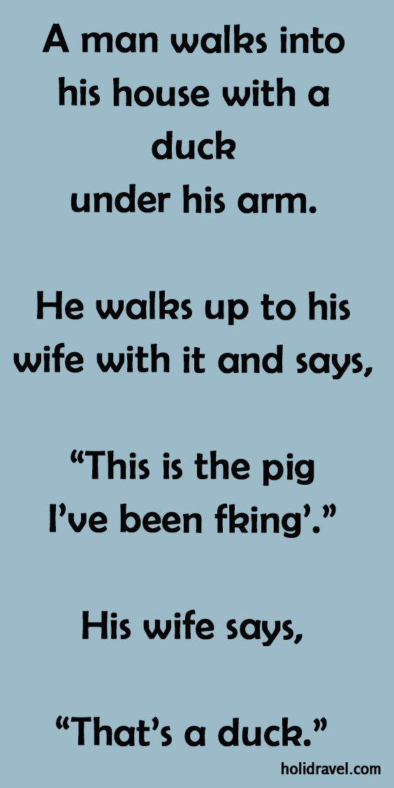 A man walks into his house with a duck under his arm. He walks up to his wife with it …