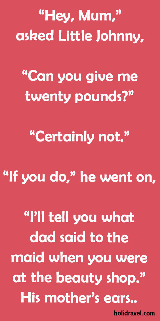 “Hey, Mum,” asked Little Johnny, “Can you give me twenty pounds?” “Certainly not.” “If you do,” he went on, “I’ll …