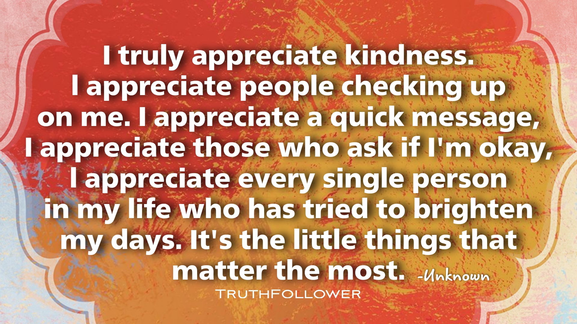 I truly appreciate kindness and people checking up on me. I appreciate a quick message and those who ask if I’m okay, l appreciate every single person in my life who has tried to brighten my days. It’s the little things that matter the most. Unknown