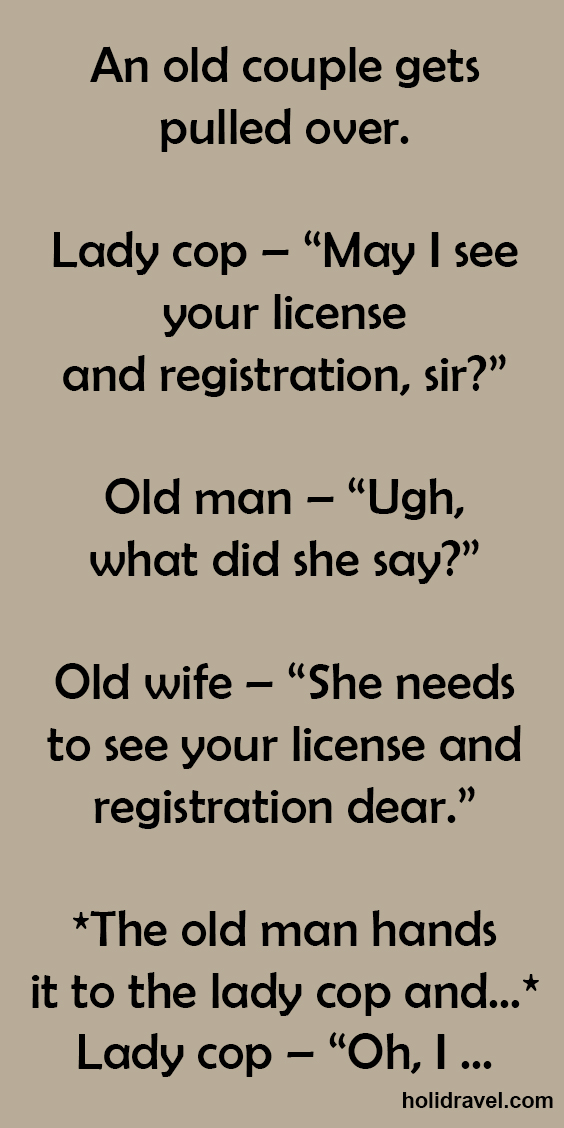 An old couple gets pulled over. Lady cop – “May I see your license and registration, sir?” Old man …