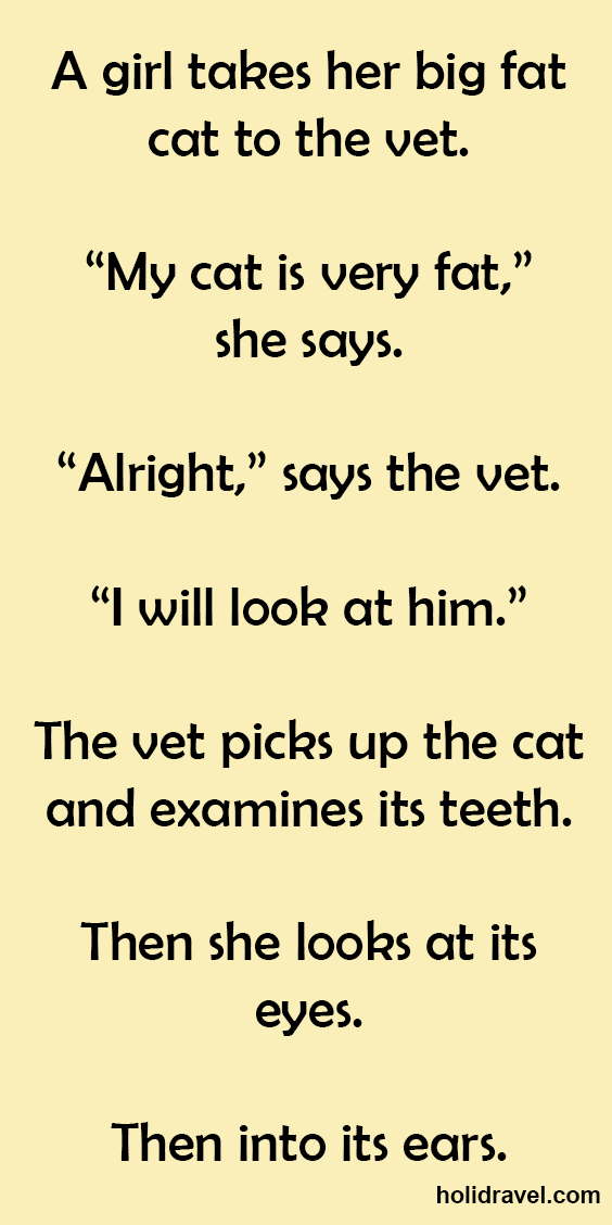 A girl takes her big fat cat to the vet. “My cat is very fat,” she says. “Alright,” says …