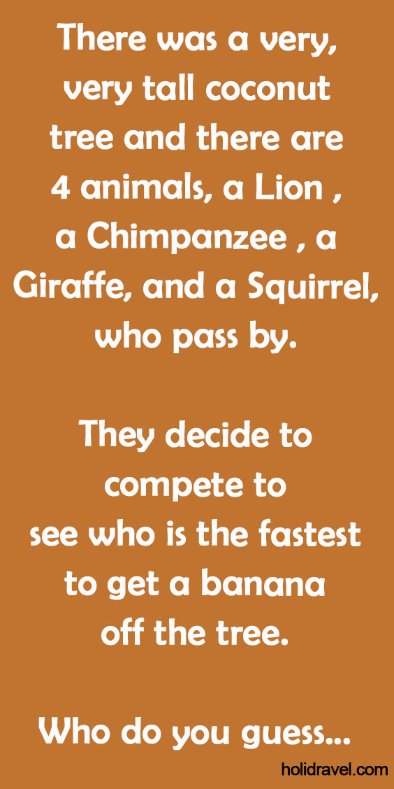There was a very, very tall coconut tree and there are 4 animals, a Lion , a Chimpanzee , a …
