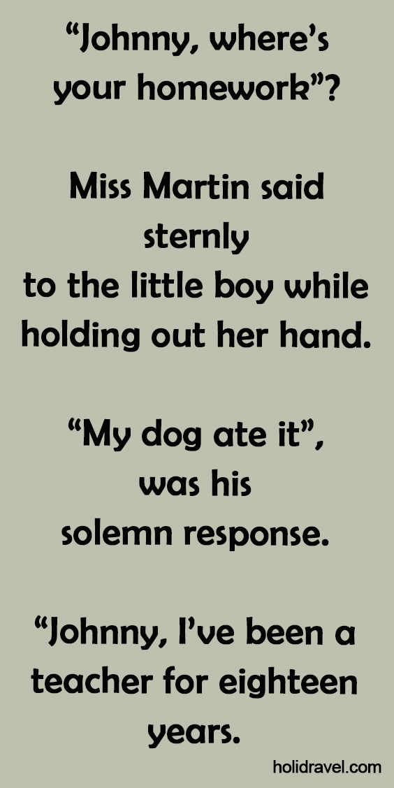 “Johnny, where’s your homework”? Miss Martin said sternly to the little boy while holding out her hand. “My dog ate …