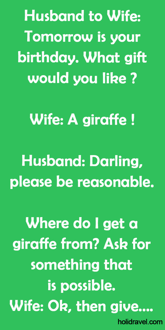 Husband to Wife: Tomorrow is your birthday. What gift would you like ? Wife: A giraffe ! Husband: Darling, please …