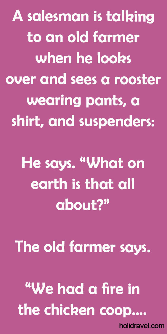 A salesman is talking to an old farmer when he looks over and sees a rooster wearing pants, a shirt, …