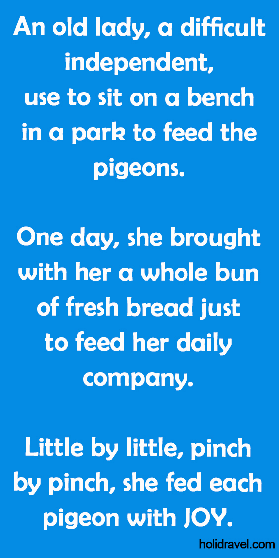 An old lady, a difficult independent, use to sit on a bench in a park to feed the pigeons. One …