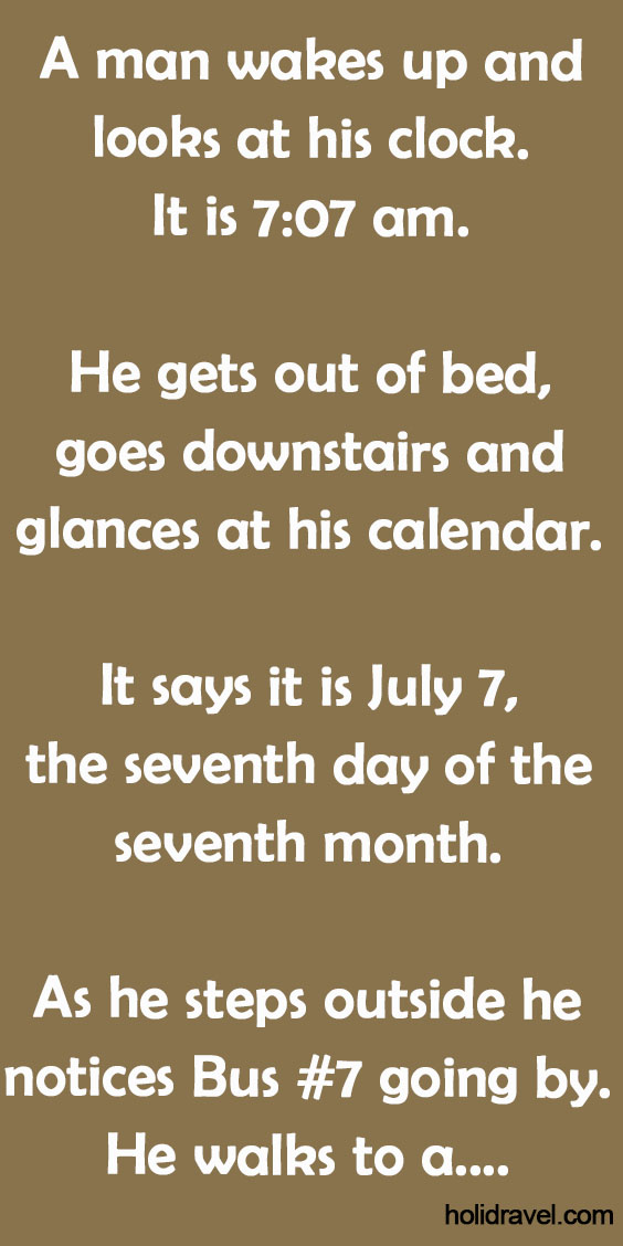 A man wakes up and looks at his clock. It is 7:07 am. He gets out of bed, goes downstairs …