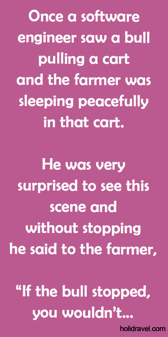 Once a software engineer saw a bull pulling a cart and the farmer was sleeping peacefully in that cart. He …