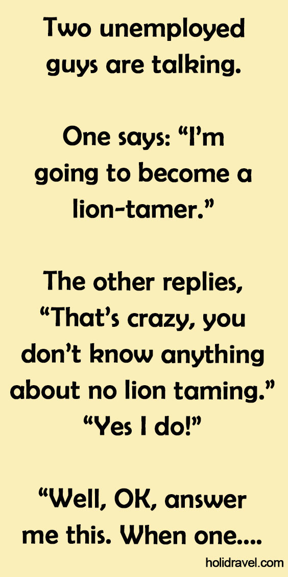 Two unemployed guys are talking. One says: “I’m going to become a lion-tamer.” The other replies, “That’s crazy, you don’t …