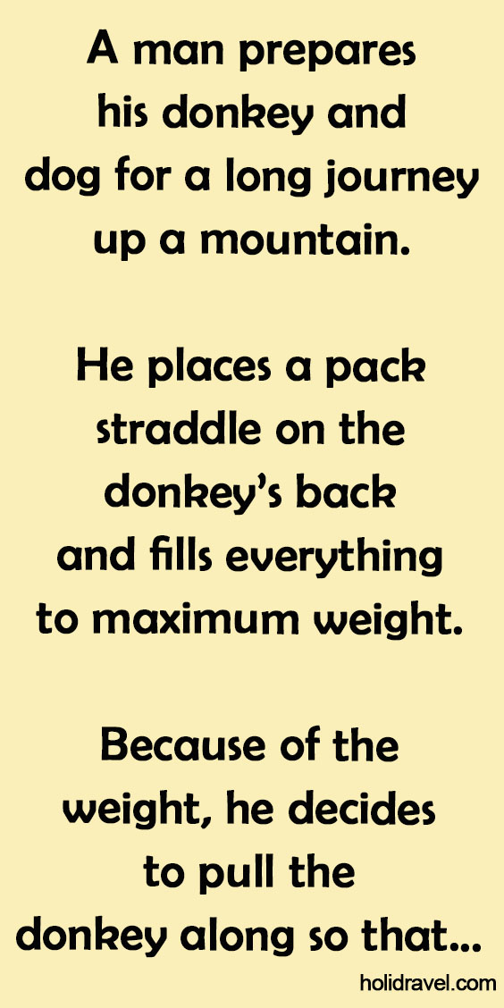 A man prepares his donkey and dog for a long journey up a mountain. He places a pack straddle on …